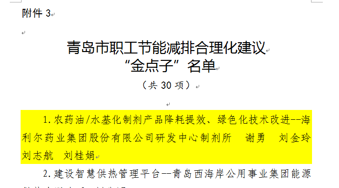 12月13日,青岛市总工会公布了2022年青岛市“查保促”活动优胜单位、安全生产标准化班组和职工节能减排合理化建议“金点子”、生产安全事故隐患排查优秀职工三项活动获奖名单。yl7703永利集团喜获青岛市“查保促”活动优胜单位;集团研发中心制剂所“农药油/水基化制剂产品降耗提效、绿色化技术改进”项目入围青岛市职工节能减排合理化建议“金点子”名单。