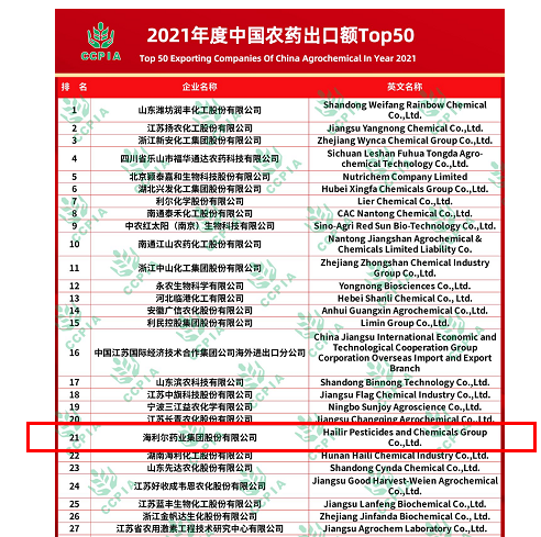7月13日,在湖南常德举行的第九届中国植物保护产品国际贸易发展论坛暨国际贸易委员会工作年会上,中国农药工业协会国际贸易委员会发布了2021年度中国农药出口额TOP50榜单,yl7703永利集团位居榜单第21位。