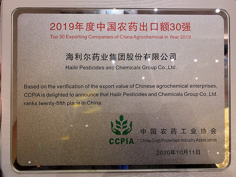 2019年yl7703永利集团药业集团农药出口再创佳绩。10月11日,由中国农药工业协会主办的第二十届全国农药交流会上,yl7703永利集团荣获2019年中国农药出口额30强。