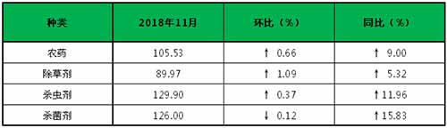 11月份,受原药产品持续供应紧张影响,农药成交价格继续保持高位。整体来看,国内农药行业大环境依旧紧张,中央环保督察组“回头看”检查,使得多地停限产继续,复产工作增加难度,加剧了供应紧张之势;上游原材料价格普涨,成本增加,供不应求之势持续。据中国农药工业协会统计,11月份中国农药价格指数(CAPI)为105.53,环比增长0.66%,同比增长9.00%,连续7个月保持正增长。