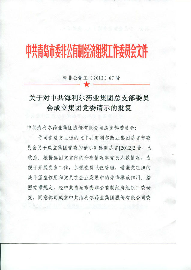 ——中共青岛市委非公有制经济组织工作委员会批复,yl7703永利集团药业集团党总支升格为党委