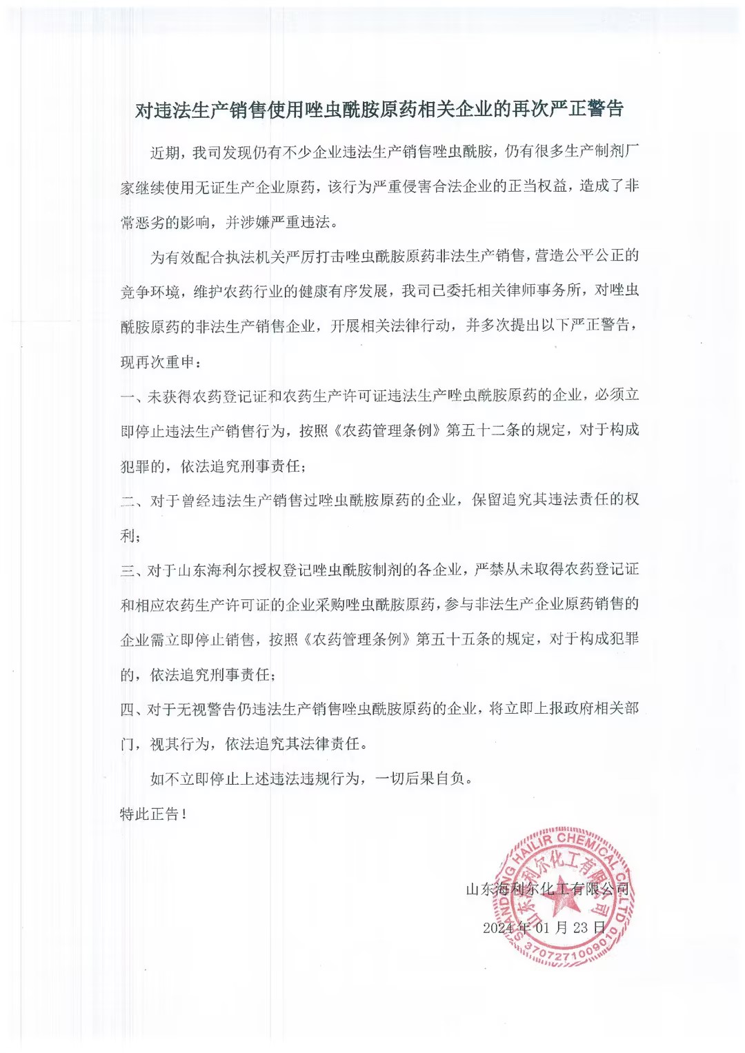 四、对于无视警告仍违法生产销售唑虫酰胺原药的企业,将立即上报政府相关部门,视其行为,依法追究其法律责任。