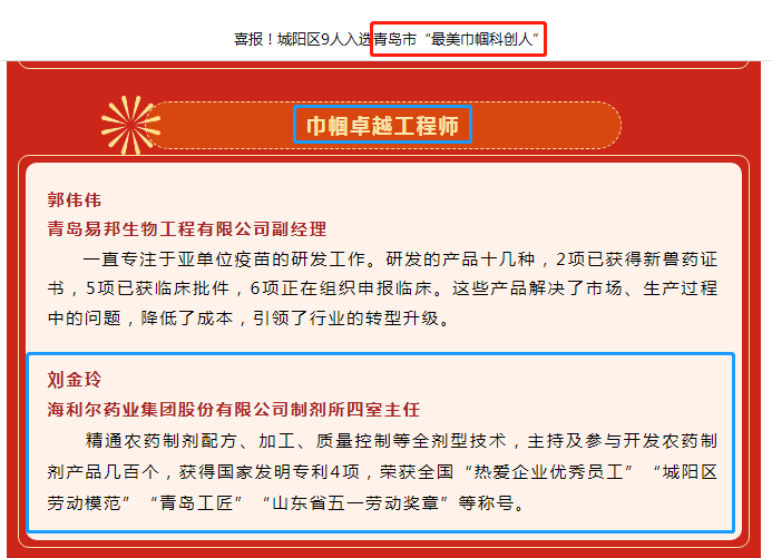 为大力弘扬新时代科学家精神,激励女性科技人才积极投身创新驱动发展战略,以巾帼智慧助力全市实体经济振兴发展、聚力推动青岛高质量发展,近期,青岛市妇联、市教育局、市科技局、市民营经济局、市总工会、市科协联合开展了寻找“最美巾帼科创人”系列活动,经过逐级推荐、评审,yl7703永利集团药业集团研发中心制剂四室主任刘金玲获评青岛市“最美巾帼科创人”,并同时被命名为“青岛市巾帼建功标兵”。