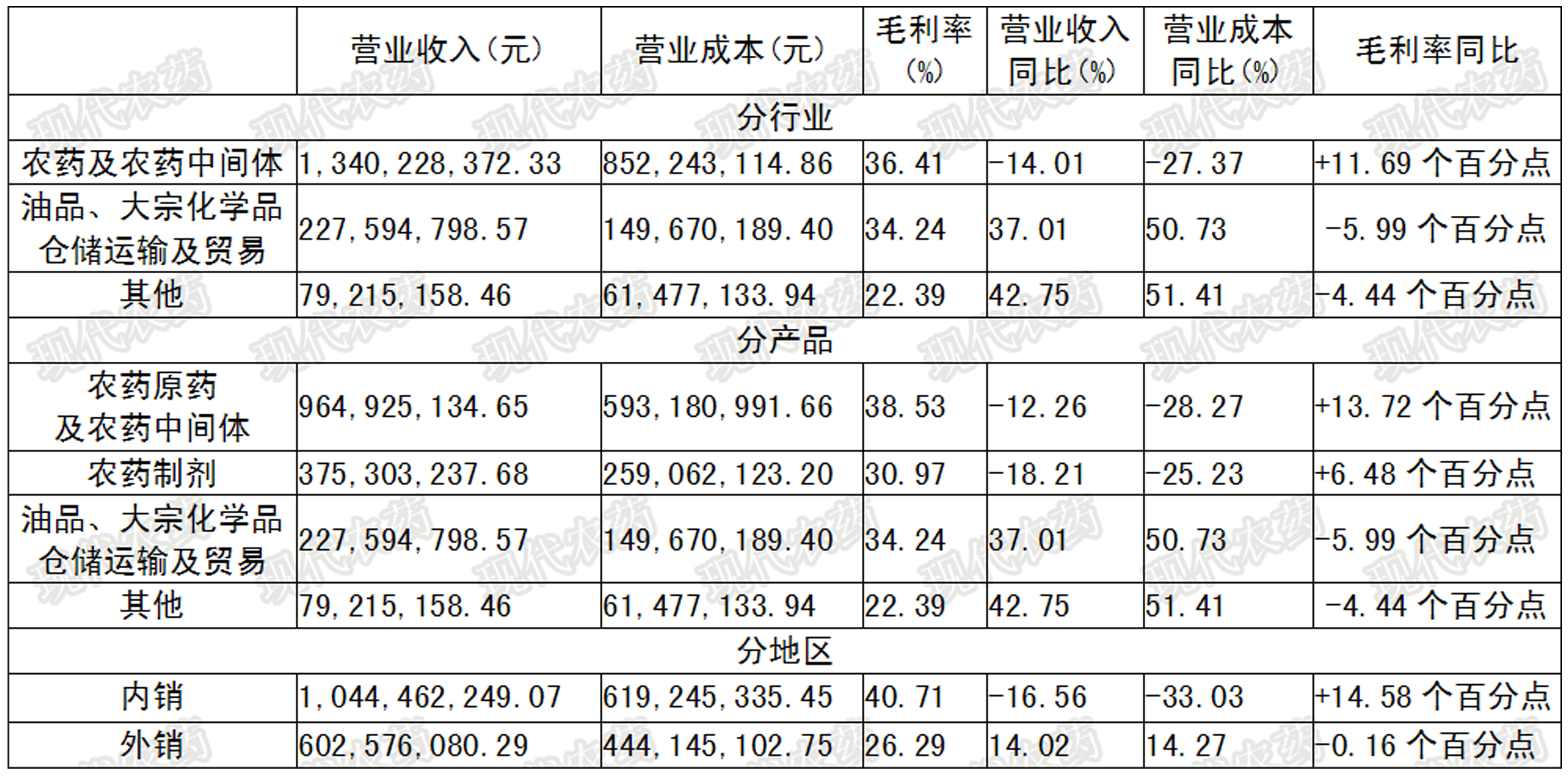 表2 辉丰股份上半年主营业务收入情况