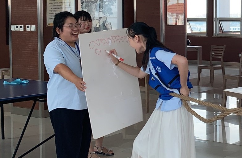 当天下午,集团总部八楼活动室内热火朝天,小伙伴们齐聚一堂,沉浸在“穿针引线”“蒙眼避障”“角力绘画”“智力逃脱”等游戏的欢乐中。