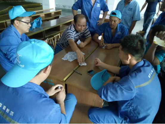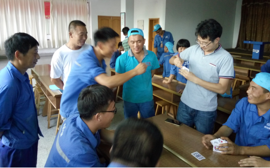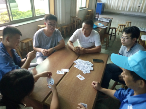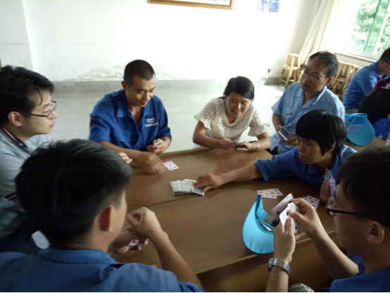 务实队&正直队最先结束对抗,正直队胜出,他们的表情也非常轻松,看来早已是胜券在握啊。诚信队&超越队在比赛过程中就比赛规则有一些小争执,我们看到裁判员已经在进行调节。比赛继续进行,超越队胜出。坦诚队&感恩队在比赛的尾声出现了逆转,原本感恩队的陈雷、陈雅雯想闷掉坦诚队的原厂长,但无奈原厂长变换了出牌方式,以致对方无法实施原计划战术,最后坦诚队胜出。在阳光队&服务队的对抗中,实力雄厚的阳光队也轻松胜出。