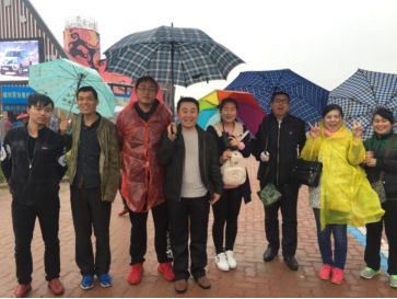 尽管这天下着雨,员工们还是兴高采烈的在家门口观看风筝表演。