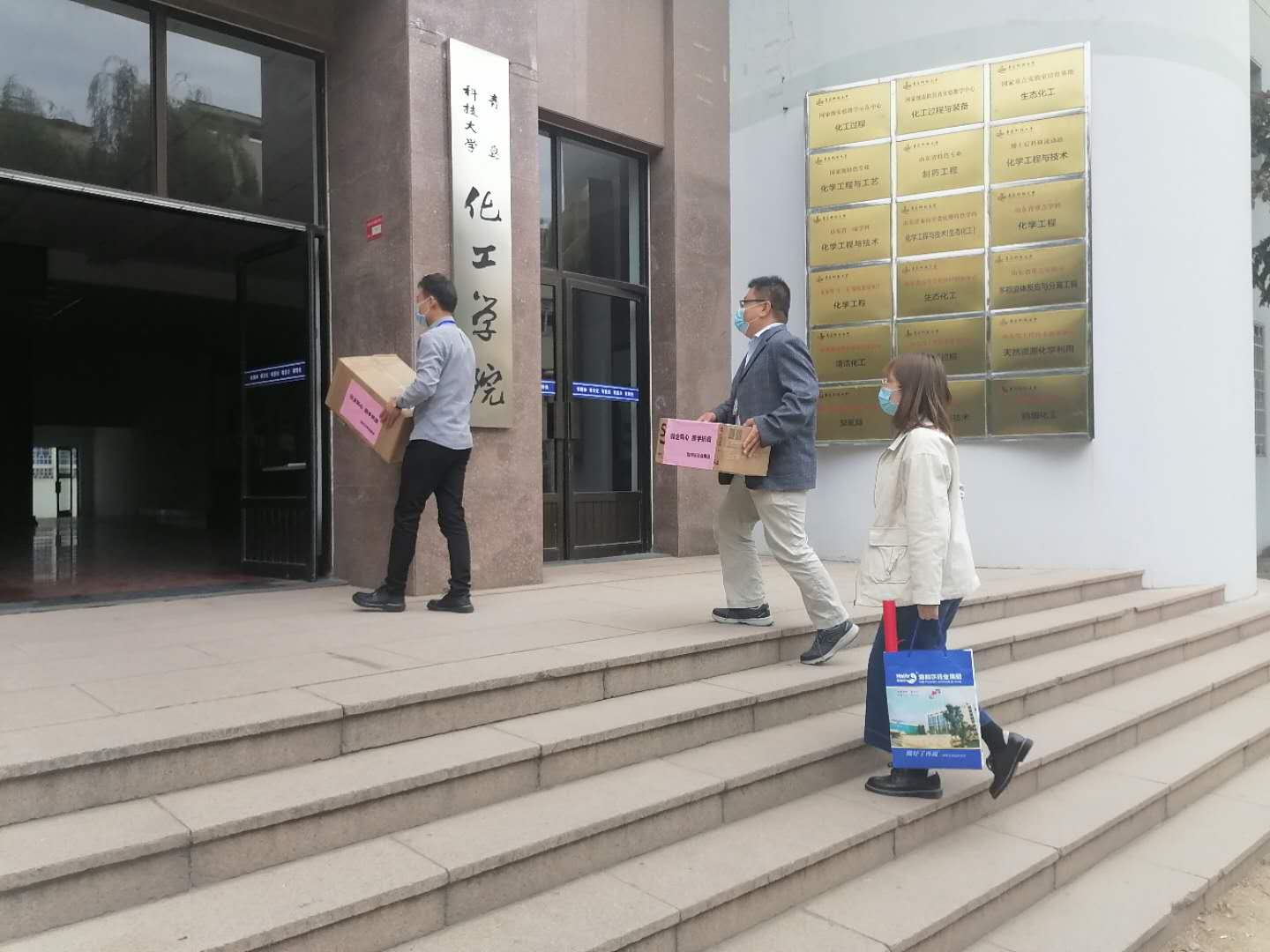 下午3时,志愿者走进化工学院,受到学院王广建教授、周欣然主席的热情接待。接收到抗疫物资后,学院李院长对yl7703永利集团的慈行善举大为赞赏,双方在“校企同心 携手抗疫”横幅前合影留念。李院长表示,yl7703永利集团是青科大的好朋友、好伙伴,多年来一直保持合作,希望这种友谊长久保持下去,并责成学院耿老师、柳老师为yl7703永利集团各项活动选好人、服好务。