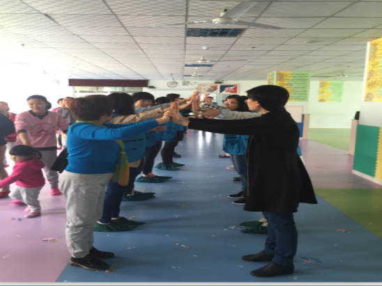 接下来就是“快乐的小火车”游戏,志愿者们主动搭起了“火车轨道”。
